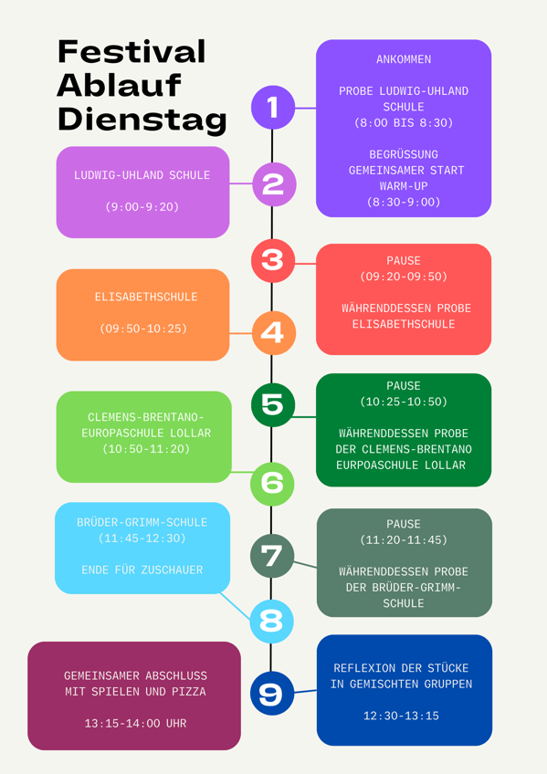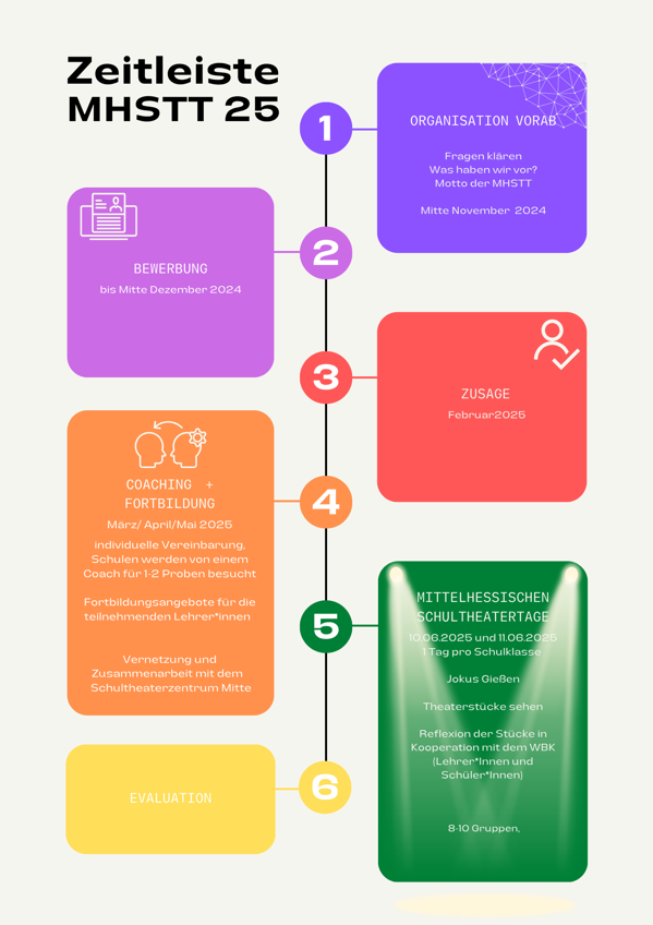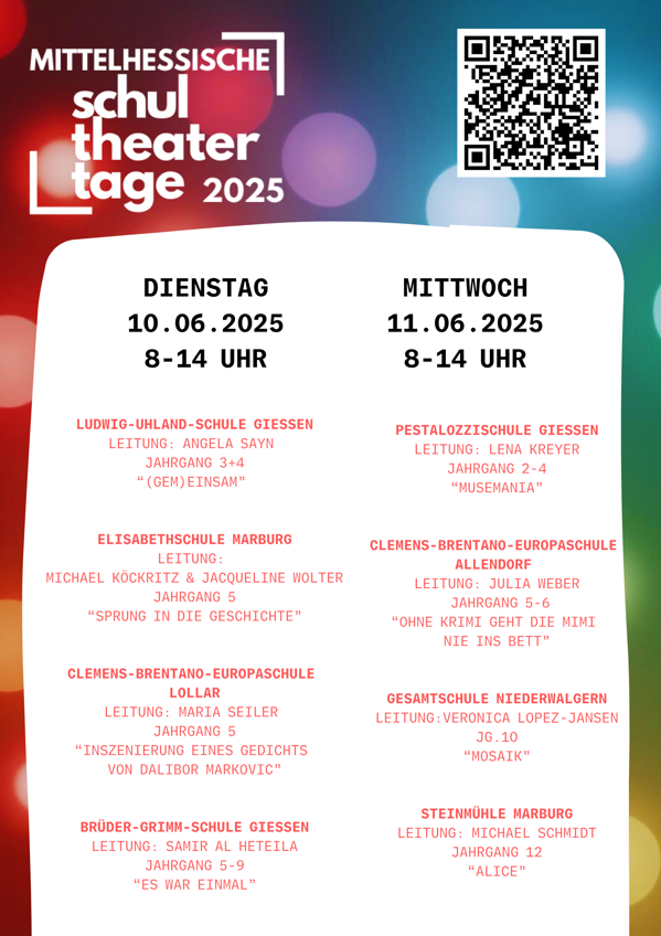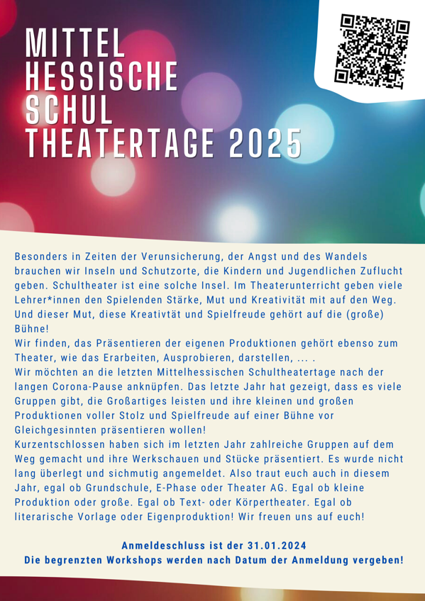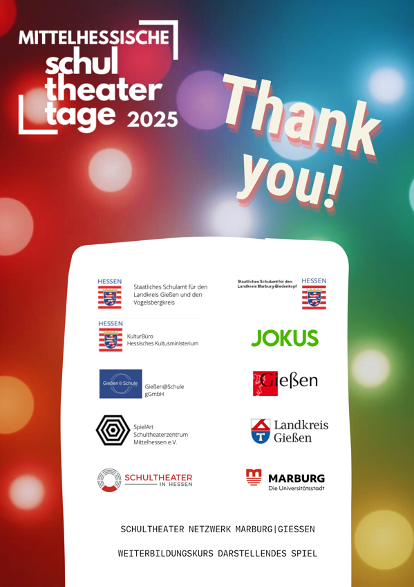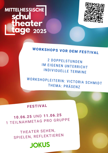 MHSTT 2024 im Jokus in Gießen Motto: "Starke Stimme - Starker Körper" In neuer Besetzung und mit einem Konzept, das auf Coaching und Präsentation der Stücke setzt, finden an zwei Tagen die Mittelhessischen Schultheatertage 2024 statt. Infomaterial zu den MHSTT 2024 Teilnehmende Schulen der MHSTT 2024 Ablauf der MHSTT 2024 Donnerstag Kooperationspartner der MHSTT 2024 Zeitungsartikel vom Gießener Anzeiger (07.06.24)